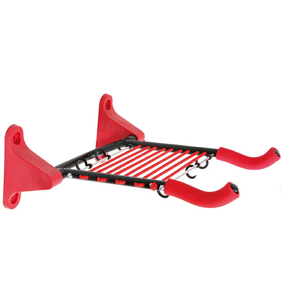 Držák kola na zeď s odkládacím prostorem a háčky pro přilbu, tretry a cyklistické oblečení. Kolo je zavěšeno za horní rámovou trubku.