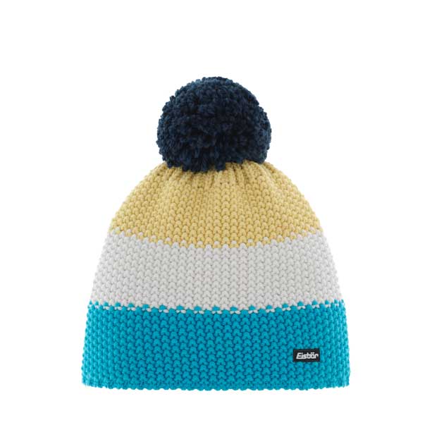 Sportovní, hrubě pletená čepice Eisbär Star Pompon MÜ. Barevné tříbarevné blokové pruhy v krásných barevných kombinacích a nadýchaná vlněná bambule.