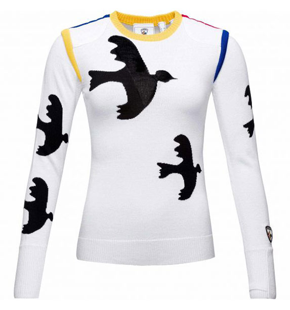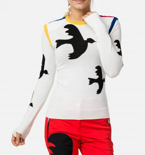Rossignol W WOOLI PULL JC DE CASTELBAJAC dámský vlněný svetr. Ženský svetr Wooli Pullover Sweater, který je vytvořen ve spolupráci s francouzskou módní ikonou Jean-Charles de Castelbajacem. Svetr je vyroben z lehké merino vlny, známé svými výjimečnými izolačními vlastnostmi a odvodem vlhkosti. Tento svetr vás udrží v pohodlí a v teple. Tento tenký lyžařský svetr zdobí tajemný let ptáků přímo z fantazie návrháře.