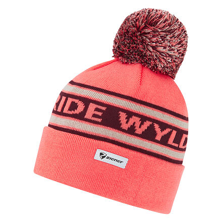 Dětská pletená čepice ZIENER IKUTO JUNIOR HAT s bambulí, ohrnovacím lemem a nápisem "RIDE WYLD". Materiál: 100% Akryl; zateplení: 100% Polyester."