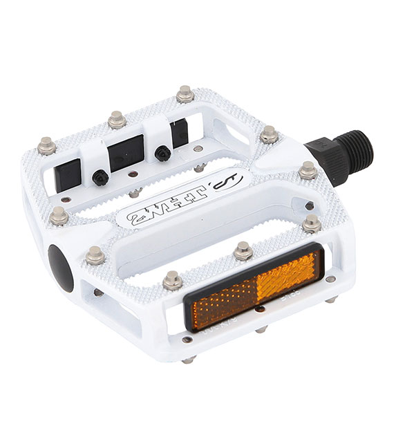 Odolné pedály v bílé barvě z jednoho kusu hliníku s CrMo osou. Kuličková ložiska a vyměnitelné piny. Odjímatelné odrazky. Váha 350g/pár