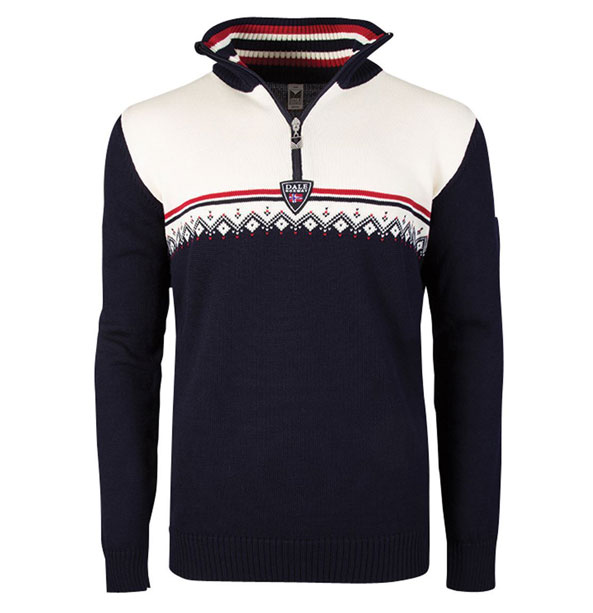 Dale Lahti pánský vlněný svetr Navy Raspberry Off white. Oficiální svetr pro norský běžecký tým v Lahti v roce 2017. Vlněný svetr ze 100% měkké merino vlny, s nórskou vlaječkou pruhovanou na přední a vnitřní straně límce. Bílá vlna odpuzuje nečistoty.