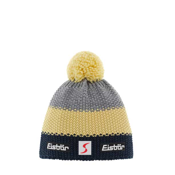 Sportovní, hrubě pletená dětská čepice Eisbär. Tříbarevné blokové pruhy v krásných barevných kombinacích a nadýchaná vlněná bambule dělají ze Star Pomp...