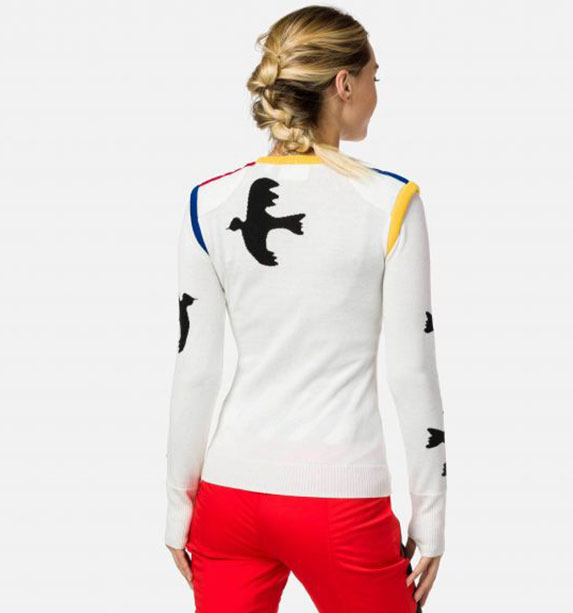 Rossignol W WOOLI PULL JC DE CASTELBAJAC dámský vlněný svetr. Ženský svetr Wooli Pullover Sweater, který je vytvořen ve spolupráci s francouzskou módní ikonou Jean-Charles de Castelbajacem. Svetr je vyroben z lehké merino vlny, známé svými výjimečnými izolačními vlastnostmi a odvodem vlhkosti. Tento svetr vás udrží v pohodlí a v teple. Tento tenký lyžařský svetr zdobí tajemný let ptáků přímo z fantazie návrháře.