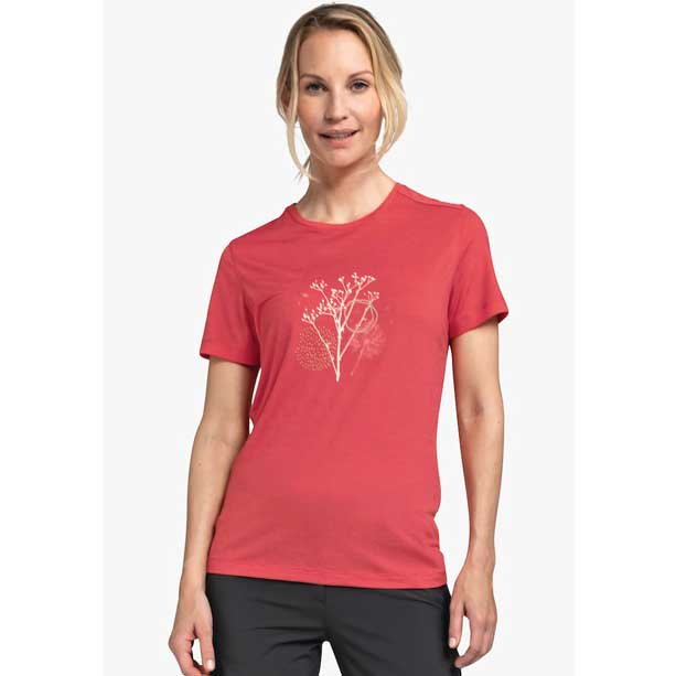 Schöffel T Shirt Hochberg dámské červené turistické tričko. Svěží přes léto - nyní můžete s tričkem od Schöffel. Nejen vícebarevný potisk dodává svěžest, ale také mix materiálu s TENCEL™. To vám umožňuje mimořádný komfort nošení, protože materiál ochlazuje vaši tělesnou teplotu a zároveň je prodyšný a rychleschnoucí. Vlhkost tak může být rychle uvolněna ven a zůstává na pokožce příjemný suchý pocit.