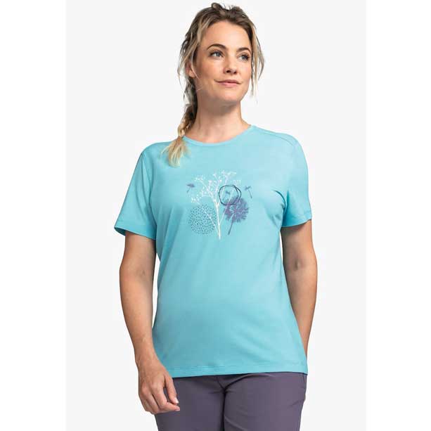 Schöffel T Shirt Hochberg dámské modré turistické tričko. Svěží přes léto - nyní můžete s tričkem od Schöffel. Nejen vícebarevný potisk dodává svěžest, ale také mix materiálu s TENCEL™. To vám umožňuje mimořádný komfort nošení, protože materiál ochlazuje vaši tělesnou teplotu a zároveň je prodyšný a rychleschnoucí. Vlhkost tak může být rychle uvolněna ven a zůstává na pokožce příjemný suchý pocit.