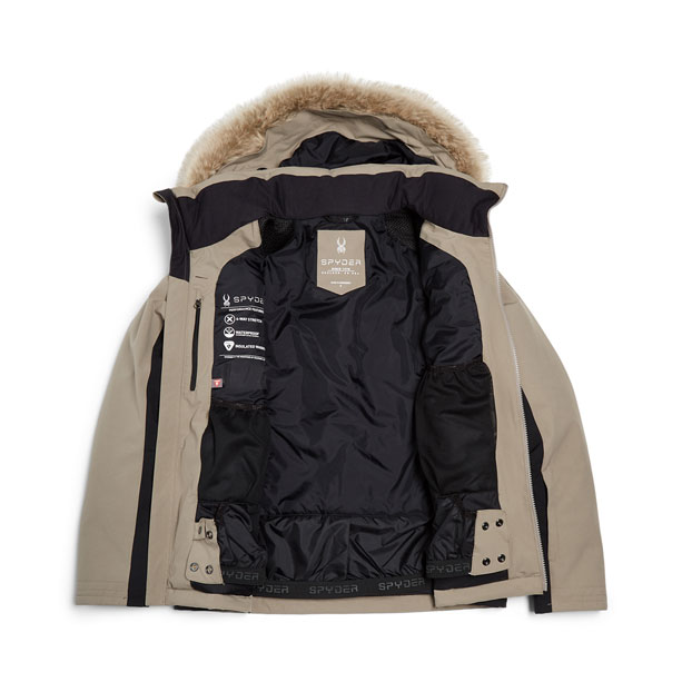 360º strečová tkanina EXO SHIELD z recyklovaného polyesteru s membránou 20.000/ 10.000 a DWR povrchovou úpravou; Izolace PrimaLoft® Black ECO (80 g); Podlepené kritické švy; Pevná kapuce s odepínacím lemem z umělé liščí kožešiny je kompatibilní s většinou lyžařských přileb; Středový přední zip YKK® Vislon®; Vnitřní kapsa na zip, síťovaná kapsa na brýle a semišová utěrka na brýle; Systém větrání v podpaží; Pevný sněhový pás; Síťované polstrování na ramenou pro komfort při nošení lyží; Nastavitelné manžety s vnitřními elastickými manžetami a otvory pro palec udržují rukávy bezpečně na svém místě; Podšívka z taffety