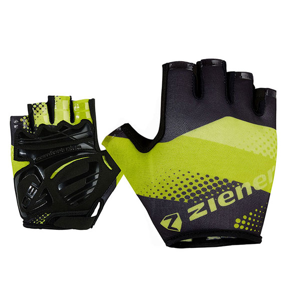 Ziener CONRADO pánské cyklistické rukavice. Legendární německá značka Ziener - technicky inovativní produkty pro cyklistický sport. Rukavice ZIENER s krátkými prsty CONRADO pro muže zaujme pohodlným pocitem na řídítkách a přizpůsobí se jednotlivě ruce. Dlaň je zároveň velmi hmatová. Díky kombinaci odolného, ​​rychleschnoucího a prodyšného materiálu AX ™ SUEDE a protiskluzového povrchu nabízí tato rukavice nejlepší přilnavost na řídítkách. Pro zdravě vypadající opálení pod cyklistickými rukavicemi je na zadní straně ruky použit opalovací materiál SUN SELECT®. Speciálně přizpůsobená nášivka na palec zabraňuje tlakovým bodům na pokožce a integrované smyčky prstů zaručují rychlé a snadné odstranění rukavic na kole.